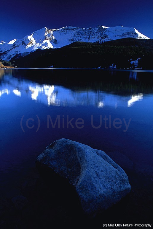 W39-1(S)—Rock, Sheep Mountain & Trout Lake, SW Colorado Trout Lake is located about ten miles from the small tourist village of Telluride in southwest Colorado. Situated at nearly 10,000 feet elevation in the Lizard Head Pass area, it’s my second-favorite spot on the planet, just behind Heceta Head Lighthouse on the Oregon Coast. This mid-’90s autumn image was taken after most of the leaves had turned and fallen and a dusting of new snow blanketed the mountain. It was bitter cold when I made this image. My hands were frozen and my fingers were numb, making the operation of the camera difficult. I was hand-holding a rectangular two-stop soft-edged graduated neutral density filter in front of my 24mm f/2.8 wide-angle lens to hold back exposure on the snowy mountain to balance the scene (the filter mount didn’t work properly on wide-angle lenses, resulting in vignetting in the corners, hence the hand-held improvisation). I was shaking and trying not to cloud the lens with my breath. The tripod’s legs were in the water in order to get the rock where I wanted it in the frame. It took several minutes to finally get the shot, but when the slides came back a few days later, it was all worth it. This image is among my favorites. I wanted the essence of simplicity for this shot, a Spartan approach to evoke a sense of loneliness with just the basic elements of the rock, the water and the mountain. The varying shades of blue add to the austere nature of the scene. There is silence here, and contemplation, and a feeling of being part of the scene for me, not just someone behind the camera. (Canon gear, Fuji Velvia ISO 50)